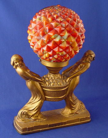 ART DECO SEMI NUDE FIGURAL LAMP WITH CZECH GLASS SHADE: Spelter figural twins holding a basket of fruit. Unsigned Czech art glass shade with 3'' fitter rim (very minor chips on rim). The lamp is numbered 248. Single socket pull chain. 15''h, the base is 9 1/2''l. Est. $400/500**
