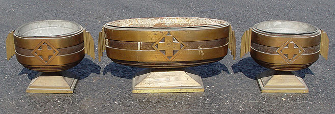 3 PIECE ART DECO BRONZE FERNER AND GARNITURE: A trio of three tin lined ferners, 7 1/2''h., the central piece is 16''l., the side pieces are 5 1/2''l. These do show signs of having been used as planters.