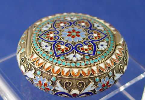 RUSSIAN ENAMELED SILVER BOX: Moscow 1896-1908, stamped ''Klingert'', silver content 84. Hinged top, 2'' dia., 3/4''h.