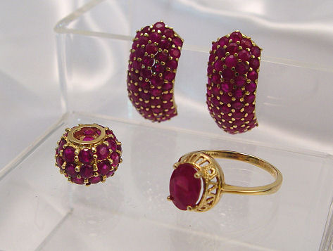 LOT OF CONTEMPORARY RUBY JEWELRY: 14k yellow gold set with red rubies. Cluster half hoop earrings on posts, and a totally encrusted round slide (missing one tiny ruby). Sold with a 10k rings set with an oval cut ruby, size 7. Sold as a lot.