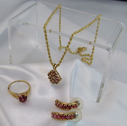 ESTATE LOT OF TOURMALINE JEWELRY: Pink tourmaline set in cluster pendant, half hoop earrings and a ring, all in 14k yellow gold. 21 small round stones in the pendant, approx. 7/8''l., currently on a 16'' twisted rope chain, 10 grams total. Earrings set with 14 oval cut stones, post backs, approx. 3/4'', 3.2 grams. And a ring set with a round cut stone, measuring approx. 4mm x 3.5mm, size 8, 2.3 grams. Sold as a lot.