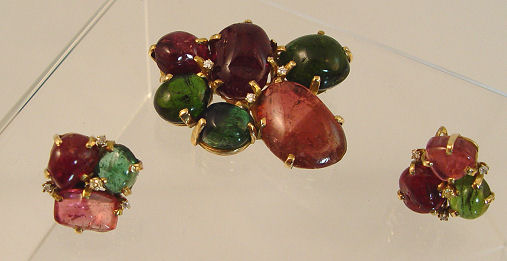 100+ctw TOURMALINE & DIAMOND ENSEMBLE FROM POTTER & MELLEN CLEVELAND OHIO: Tumbled cabochon nuggets of pink and green tourmaline, prong set in 14k yellow gold with diamond accents, approx. 30pts total. Brooch marked Potter Mellen 14k, measures approx. 1 7/8'' x 1 3/8'', screw back earrings marked 14k, measure approx. 7/8'', 47 grams total.