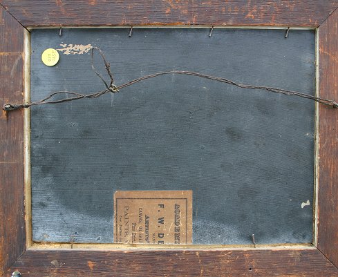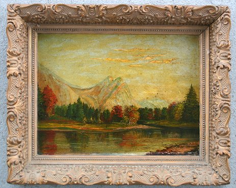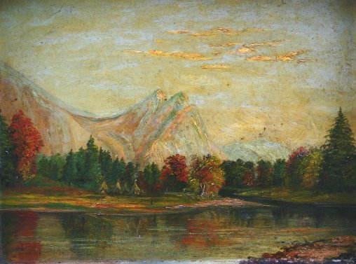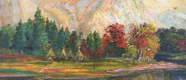 AMERICAN SCHOOL WESTERN SCENE WITH INDIAN ENCAMPMENT: O/B, 9 1/4'' x 12 3/4'', no visible signature, period frame with overpaint, 13'' x 16''.