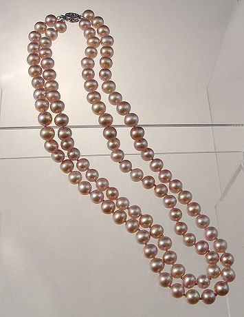 16'' DOUBLE STRAND of 8MM LAVENDER PEARLS: 8mm pearls with slight potato shape, double knotted 14k white gold filigree pressure clasp with built in safety bar. Est. $150/300**