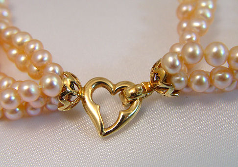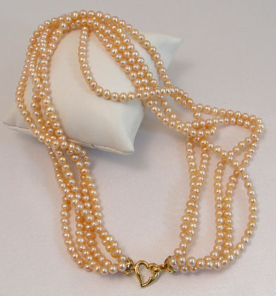 18'' FIVE STRAND PINK PEARL NECKLACE: Five strands of fresh water cultured pearls, approx. 4.5 - 5mm in size, lovely light peachy pink color, 14k heart shaped clasp. Sold with current Tampa Gemological Laboratory appraisal, replacement price $600.00.
