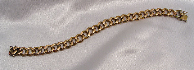 18K YELLOW GOLD CABLE LINK BRACELET, 8 INCH: Approx. 10mm wide links, both parts of pressure clasp marked 18k, signed H.K., double safety latch, 42 grams.