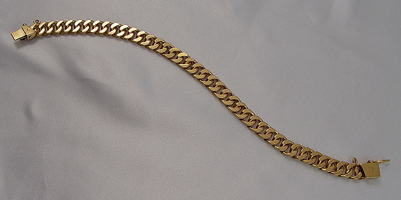 18K YELLOW GOLD CABLE LINK BRACELET, 8 INCH: Approx. 7mm wide links, European manufacture, pressure clasp marked YI & leaf 750, safety latch, side loops present for safety chain, 31 grams. Bracelet can lay flat but seems to prefer the links to twist.