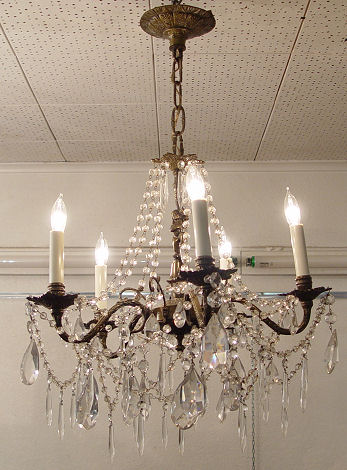 BRONZE AND CRYSTAL CHANDELIER: 5 light, 5 arm chandelier featuring three tiers of chain and drop prisms. Petite in size, it hangs 29''.