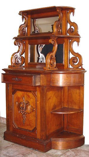 VICTORIAN ETAGERE SIDE CABINET: Rich walnut cabinet with mirror back shelved top, scroll carved supports, grape motif carvings on door. Open shelves on curved sides. 66''h. x 47''w. x 19'' deep.