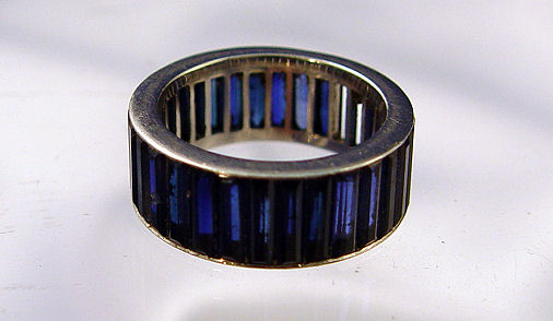 PLATINUM ETERNITY BAND WITH SYNTHETIC BLUE SAPPHIRES: Acid tested platinum band set with 29 baguette cut stones, 1/4'' wide, size 5, 6 grams.