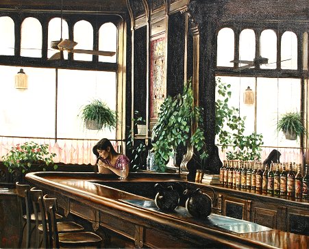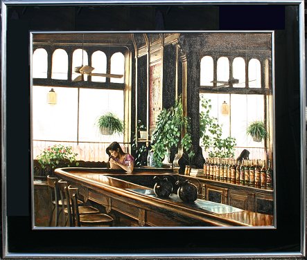 MCCORMICK, Harry, (American, 20th C. ): Tavern Interior with Woman, O/C, , 40'' x 50'', signed LL, dated 1985, custom frame with wear, 54'' x 64''. Estate of Marie Masini.