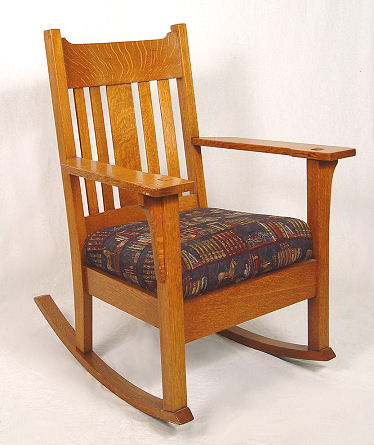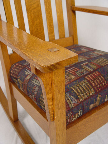 GOLDEN OAK ARTS & CRAFTS ROCKER: 5 vertical slat back, shaped top rail. Corbel and through tenons on shaped arms. Refinished condition. Spring seat is newly covered. 37'' x 27'' x 20''.
