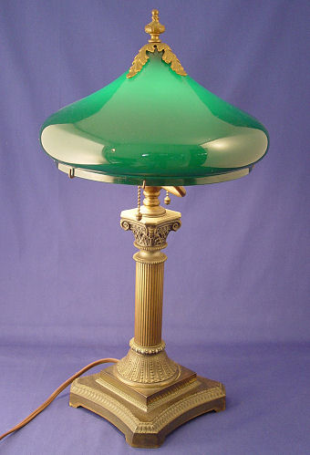 VINTAGE MILLER TABLE LAMP WITH GREEN SHADE: Green cased glass shade (minor chips on the fitter rim), the base is marked EM & Co. Two sockets with pull chains ending in acorns. The lamp is 21 1/2''h. shade is 10'' dia.