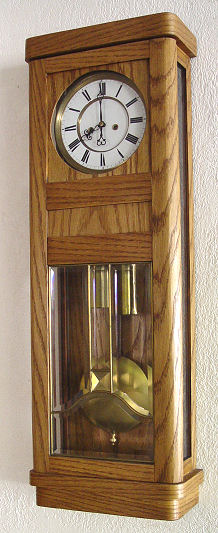 OAK CASE GERMAN REGULATOR WALL CLOCK: Weight driven, 8 day time & strike. Beveled glass and oak case. 33 1/2''h. x 11 1/2'' x 5''. Good working order, maker unknown.