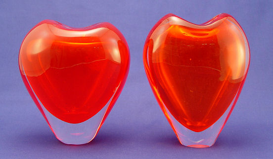 PAIR SALVIATI CUORICINO ITALIAN ART GLASS VASES: Red violet vases in the form of a heart. Signed Salviati. 7.5''h. Retails for over $500 each.