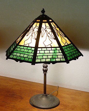 VINTAGE BRADLEY & HUBBARD SLAG GLASS TABLE LAMP: 8 panels with caramel and green glass, acorn finial, bronzed iron base, double socket pull chain. Unsigned, 23''h, shade is 17'' dia. Glass is free of cracks.