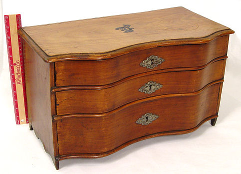 MINIATURE OR CHILD'S SERPENTINE FRONT CHEST: Possibly a jewelry chest, dovetail construction, original escutcheons, 11'' x 18 1/2'' x 19 3/4''