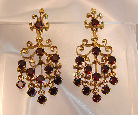 GARNET CHANDELIER EARRINGS: 14k yellow gold set with 24 round cut garnets of deep red tone, measuring approx. 3.2mm x 2mm, 1 3/4''l., 7 grams.