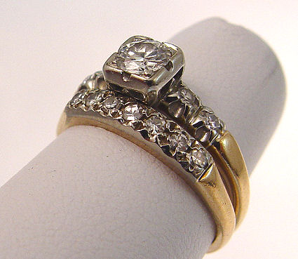 DIAMOND BRIDAL SET: Approx. 35pts total of round brilliant cut diamonds the largest centering the engagement ring and measuring approx. 4.5 x 2.5mm, flanked on each side by two single point diamonds with 7 matching single point diamonds to the wedding band. Both bands with shanks of yellow gold and tops of white. Engagement ring marked Traub? 14k Plumb, size 5.25, 1.9 grams; wedding band marked JLH 14k 1 Pat. PD, size 5.5, 1.6 grams.