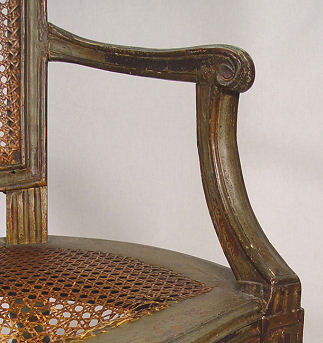 EARLY LOUIS XVI OPEN ARMCHAIR: Cane back and seat, mortised and pegged construction, older ''shabby'' green paint with traces of gilt. Cane seat will need to be replaced. 36''h. x 24 1/2''w.