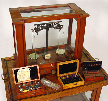 HENRY TROEMNER BALANCE SCALE: Wood and glass case with lift front. Ivory label states ''Made by Henry Troemner for Arthur Thomas Co. Philadelphia'', 15 1/2'' x 17'' x 9''. Sold with three sets of weights. One box is Christian Becker, one is Arthur Thomas. Neither of the sets of weights are complete.