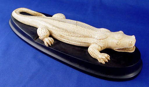 CHINESE CARVED IVORY ALLIGATOR: Most unusual form, the ivory is 11''l x 3 1/3''w. Mounted on a wooden base. Est. $800/900**