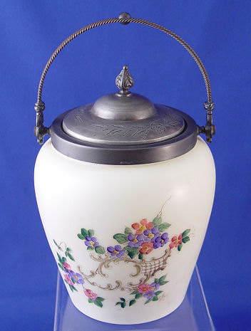 PAIRPOINT HAND PAINTED GLASS BISCUIT JAR: Pairpoint Glass Co. paper label. Silverplate mounted , 8''h.