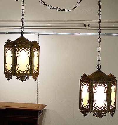 PAIR OF VINTAGE SLAG GLASS HANGING LIGHTS: Gold finished ornate metal lantern, 6 panels of caramel slag glass panels.