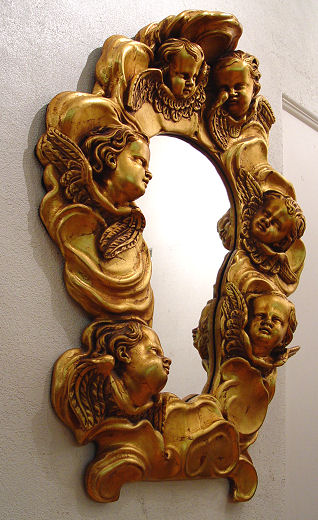 CHERUB HEAD DECORATIVE ANGEL MIRROR: Gold finish on composition, 46 ' x 38'', later 20th C.