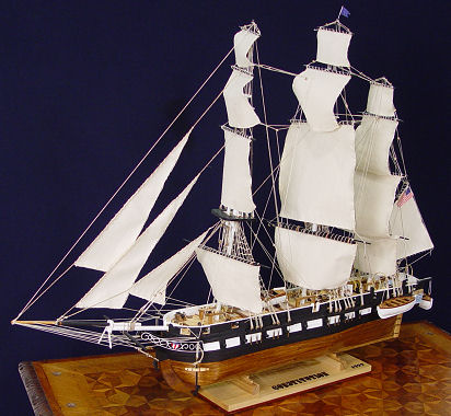 MODEL OF THE TALL SHIP USS CONSTITUTION: Museum quality, hand crafted by a local retired Navy man, not from a kit. Highly detailed and shown at full sails. Wood, copper with other metals, cloth, and string construction. Constitution was commissioned in 1799. 32''h. x 42 1/2''l x 12'' at the widest. Est. $500/700**