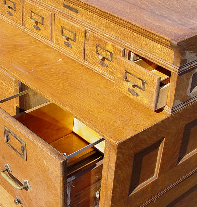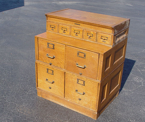 GOLDEN OAK FILE CABINET: In five parts, the base, the two being file drawers, the recessed section of drawers and the top. This cabinet was once owned by Phillipe Landrey, Speaker of Senate, Providence of Quebec. The recessed upper files hold 3 x 5 cards. Overall the cabinet is 39 1/4''h. x 33''w. x 25''. The metal plate says ''Office Specialty Mfg. Co. Ltd. Toronto Canada''