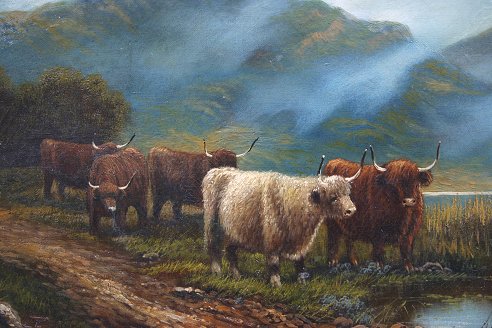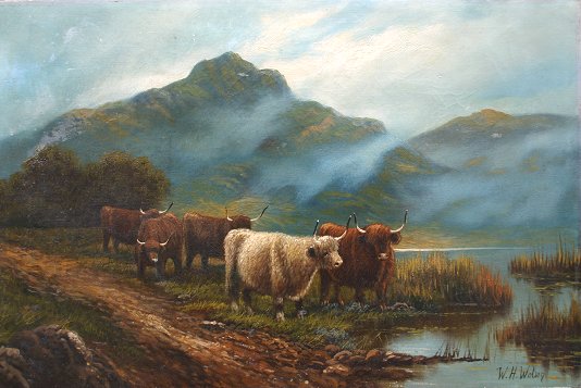 WATSON, W.H., (British, 19/20th C.): Highland Cattle, O/C, 16'' x 24'', signed LR, unframed.