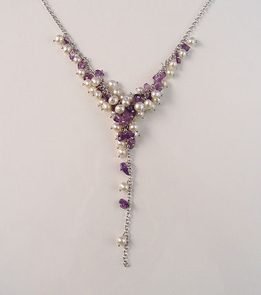 CULTURED PEARL & AMETHYST NECKLACE: Sterling necklace with a cluster of amethyst chips and cultured fresh water pearls, 18'' necklace plus 3'' central dangle.
