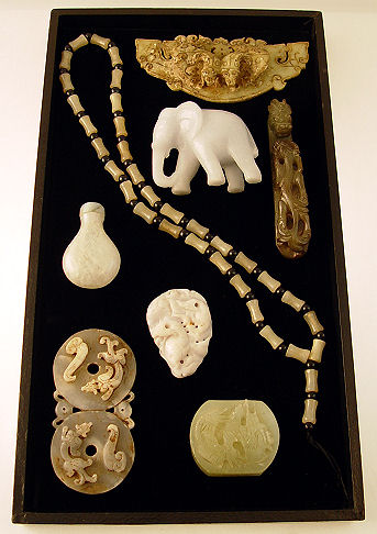 8 PIECE COLLECTION OF CARVED JADE: Includes girdle hook, 24'' strand of beads, snuff bottle 2,3/8'', elephant, 2 1/2''h, carved discs. Age and stone quality unknown.