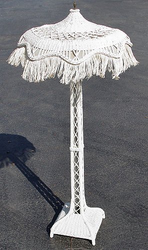 VINTAGE WICKER LAMP WITH FRINGED SHADE CA 1910: White fiber wicker base and shade, lamp is 70''h., the shade is 27'' dia.
