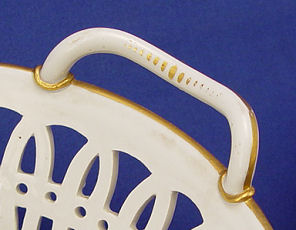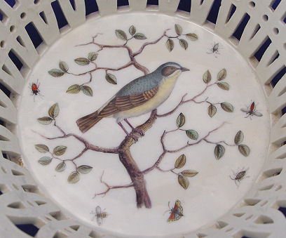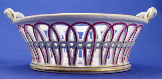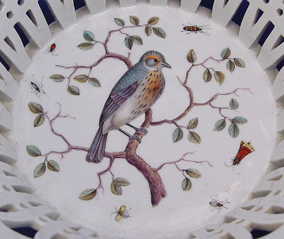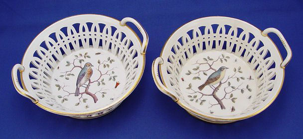PAIR OF FURSTENBERG PORCELAIN RETICULATED BASKETS: Gold accents on rims and handles, center features a naturalistic image of bird and insects. One of the baskets bears the blue F mark. 9'' dia. 4''h.