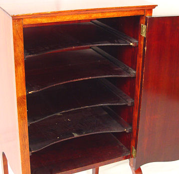 INLAID MAHOGANY MUSIC CABINET: Single door cabinet with original slide out shelves to inside, inlaid in bell flower design, slight cabriole legs, 39''h. x 19 1/4''w. x 15''d. Refinished condition.