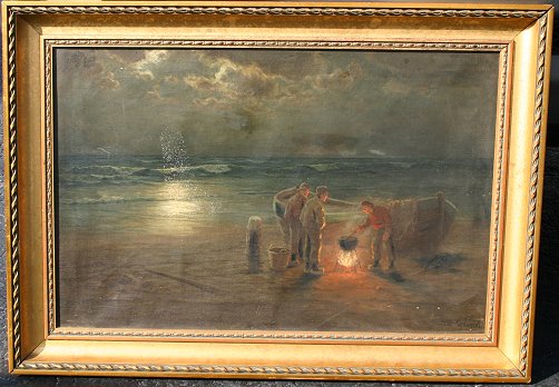 GABRIEL, H.M., (French, 20th C.): Moonlit Beach Campfire, O/C, 20 1/2'' x 31'', signed LR, gold frame with wear, 25 1/2'' x 36''.