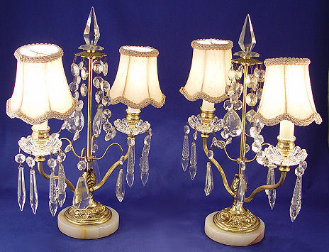 PAIR OF DECORATIVE BRASS AND CRYSTAL 2 LIGHT CANDELABRA LAMPS: Marble base, crystal prisms, silk shades. 16'' x 11''.