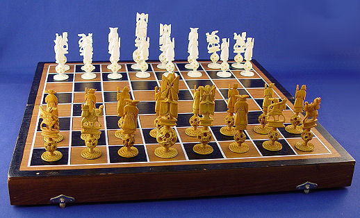 CHINESE CARVED IVORY CHESS SET: On wooden playing board / storage box. The king is 4 3/8''h.