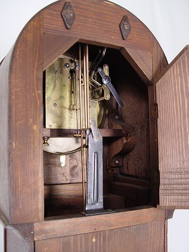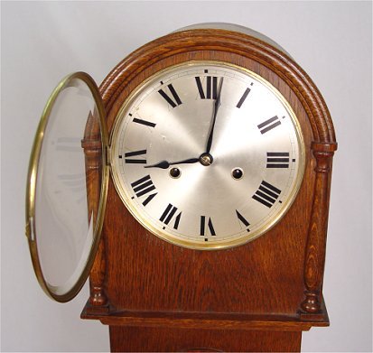DIMINUTIVE OAK TALL CASE CLOCK: American, circa 1900 - 1925. Having a domed hood case flanked by 1/2 column ends, raised panel, ogee bracket feet. The steel face dial with Roman numerals. 52 1/2''h. x 9 1/2''w.