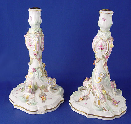 MEISSEN GERMAN PORCELAIN CANDLE HOLDERS: Blue cross sword marks under glaze. Applied and hand painted flowers, leafy vines and bug ornamentation. 10''h. the base is 6'' dia.