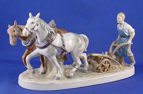 CARL SCHEIDIG GRAFENTHAL PORCELAIN FIGURAL GROUPING: German porcelain depicting a farmer at plow behind two draft horses, one grey with ''rope'' attaching him to plow, the brown horse with place for ''tack'' but not present. Marked with pre 1972 mark to bottom, green eagle mark and Germany stamp. 14''l. x 5 1/4''w. x 7 1/8''h.