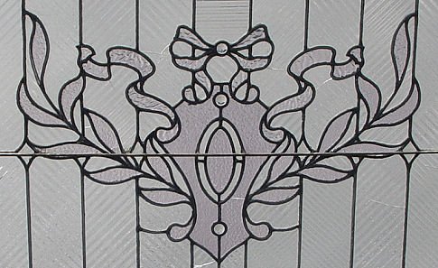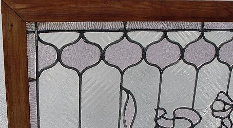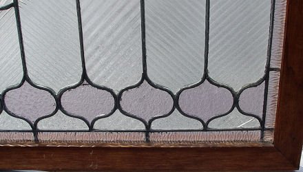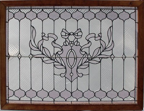 LEADED GLASS PANEL, CA 1900: Light amethyst and clear, all with texture, framed, with hooks for hanging. Some cracks in glass, but overall a lovely panel. 30'' x 40 1/2''.