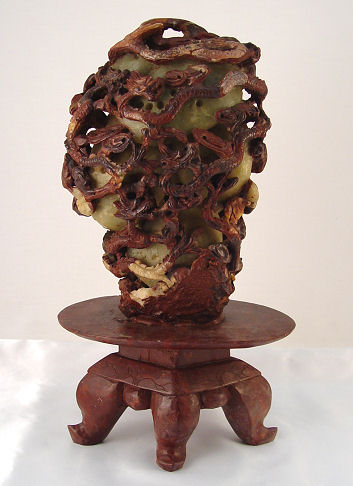 LARGE CHINESE SOAPSTONE CARVING OF INTERTWINED DRAGONS: Red stone dragons over a large green stone, mounted on carved base, 13 1/2''h. a 7''.
