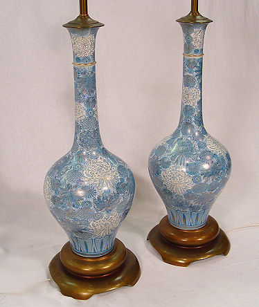 JAPANESE IMARI PORCELAIN VASE LAMPS: Blue all over chrysanthemum design. Porcelain is 20''h, lamps are 36''h. overall.