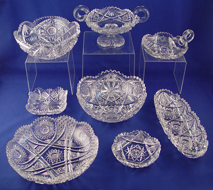 8 PIECE ESTATE COLLECTION OF AMERICAN BRILLIANT CUT GLASS: To include 1) double handle pedestal bowl, 4 1/2''h. 6''dia. 2) 8'' berry bowl. 3) another 8'' berry bowl 4) 5'' square dish 5) 5'' dia. low bowl. 6) loop handle nappy 7) 11'' long relish dish.