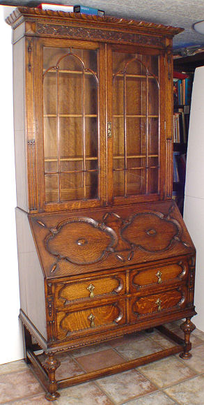 ENGLISH OAK SECRETARY BUREAU BOOKCASE: Upper section has carved cornice and glazed doors. The lower section desk is fitted with pigeon holes and drawers with a leather top writing surface. Unusual set of 4 half length drawers with deeply paneled fronts. Stretchers between the four legs. 86'' x 40'' x 21''. Est. $1800/2200**