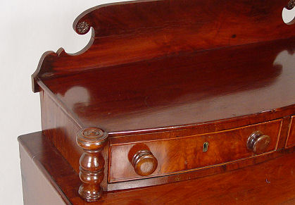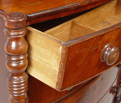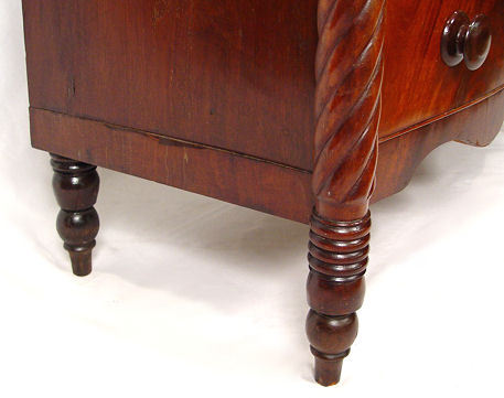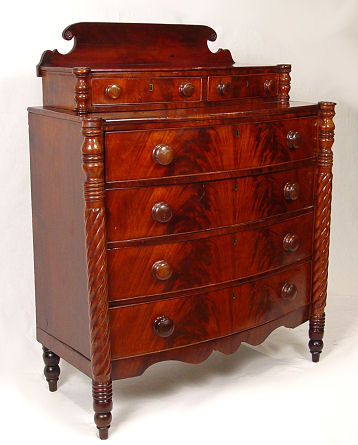 19th C BOWFRONT MAHOGANY CHEST OF DRAWERS: 2 drawers recessed over 4 full length drawers, shaped backsplash, spiral carved full round stiles, 48''h. x 38 1/2'' x 18''.