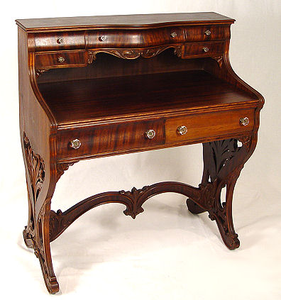 VICTORIAN LADIES DESK: The sides and legs are one ornately carved board. A series of drawers comprise the upper section, two half length drawers at the writing level. Glass knobs throughout. Desk is 41''h. x 36'' x18''. Please call for condition.